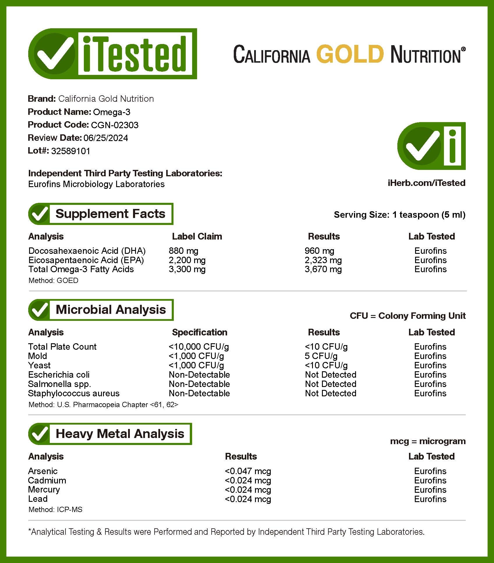 Концентрированный рыбий жир с омега-3 от California Gold Nutrition® содержит 3300 мг омега-3 в форме триглицеридов. Продукт обрабатывается в Норвегии. Удобную жидкую добавку с натуральным лимонным вкусом легко добавить в свой ежедневный рацион.